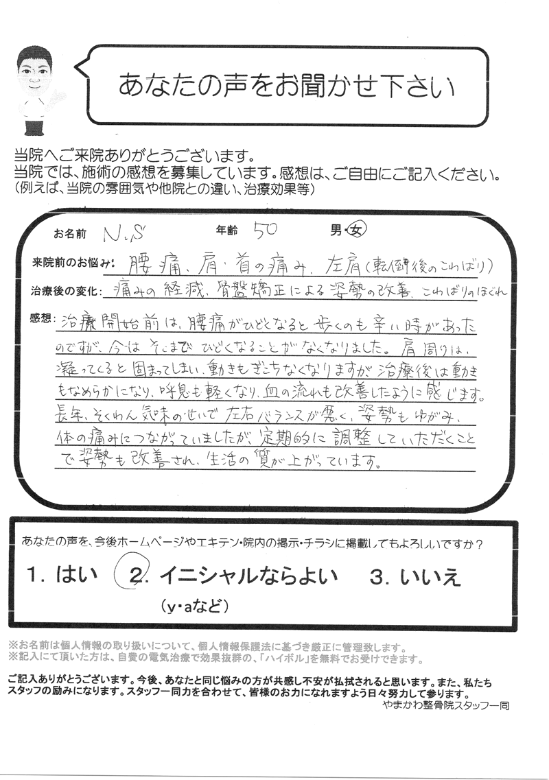長年、側湾気味のせいで左右バランスが悪く、姿勢もゆがみ、体の痛みにつながっていましたが、定期的に調整していただくことで姿勢も改善され、生活の質も上がっています。(N.S様 50歳 女性)