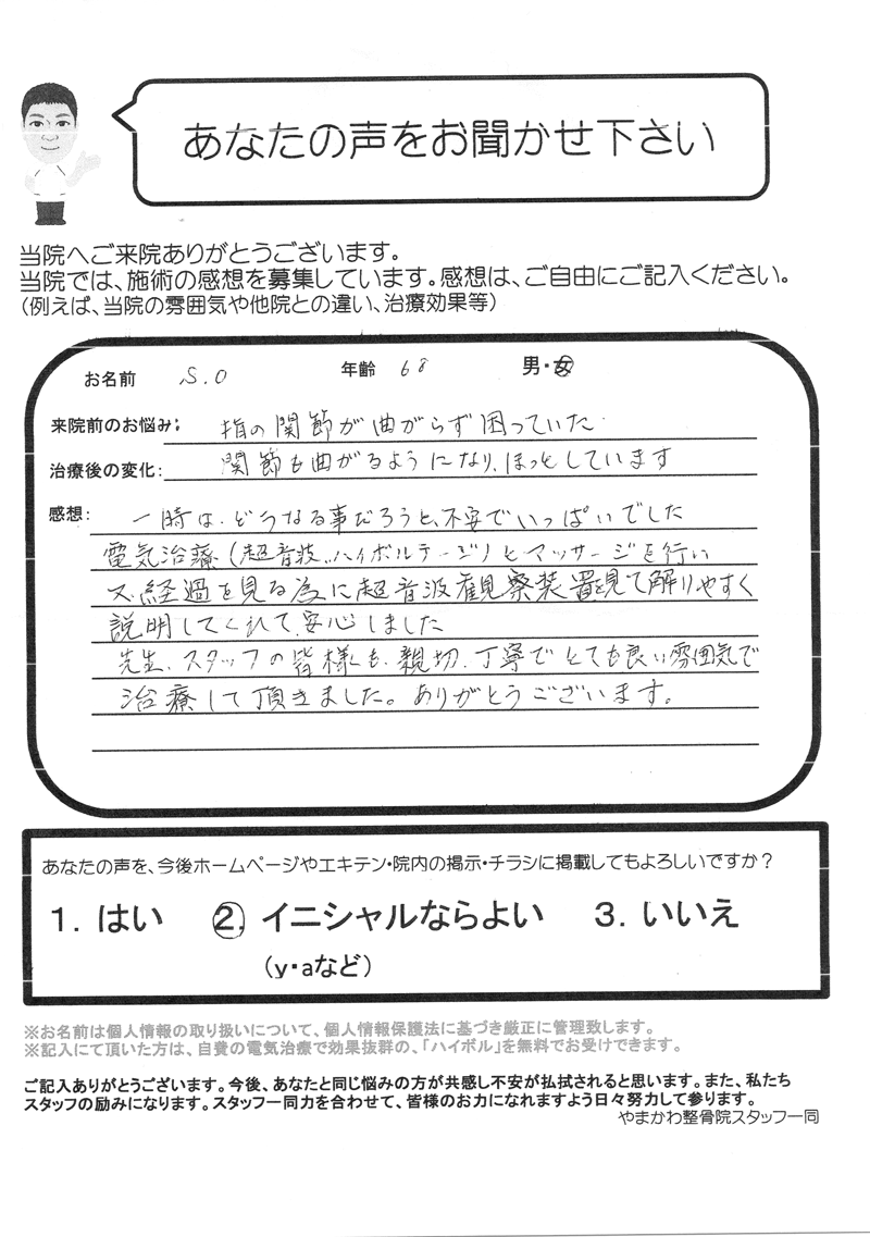 先生、スタッフの皆様も親切・丁寧でとても良い雰囲気で治療して頂きました。ありがとうございます。(S.O様 68歳 女性)