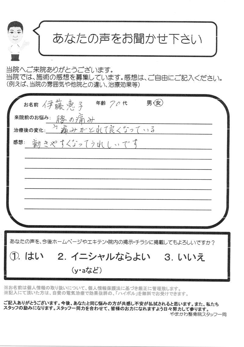 今まで、良いとされる治療院をあちこち行きましたが、どこも改善されず悩んでいました。しかし、先生の治療法でとっても良くなり、生活が楽になりました。