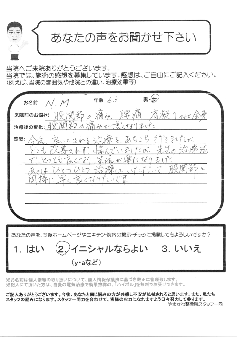 腰痛や肩こりなど全身を治療していただいていますが、股関節と同様に早く良くなりたいです。(N.M様 63歳 女性)