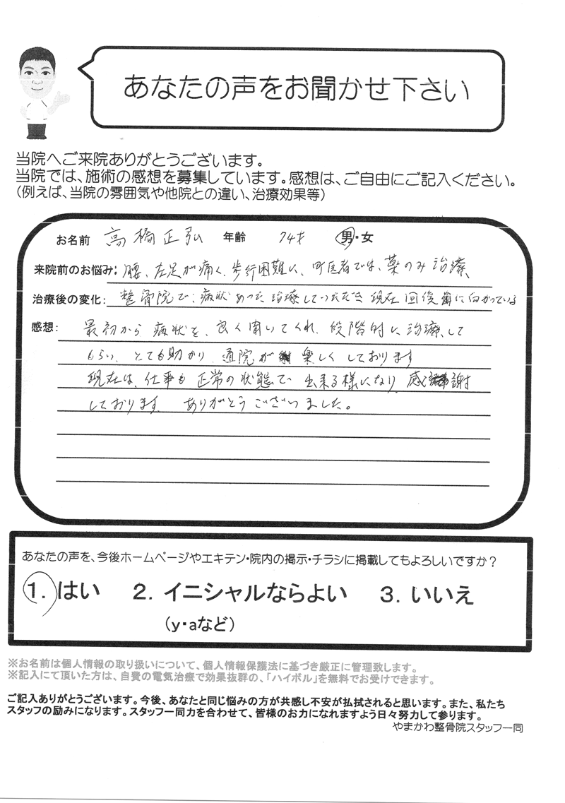 現在は、仕事も正常の状態で出来るようになり、感謝しております。ありがとうございました。(高橋正弘様 74歳 男性)