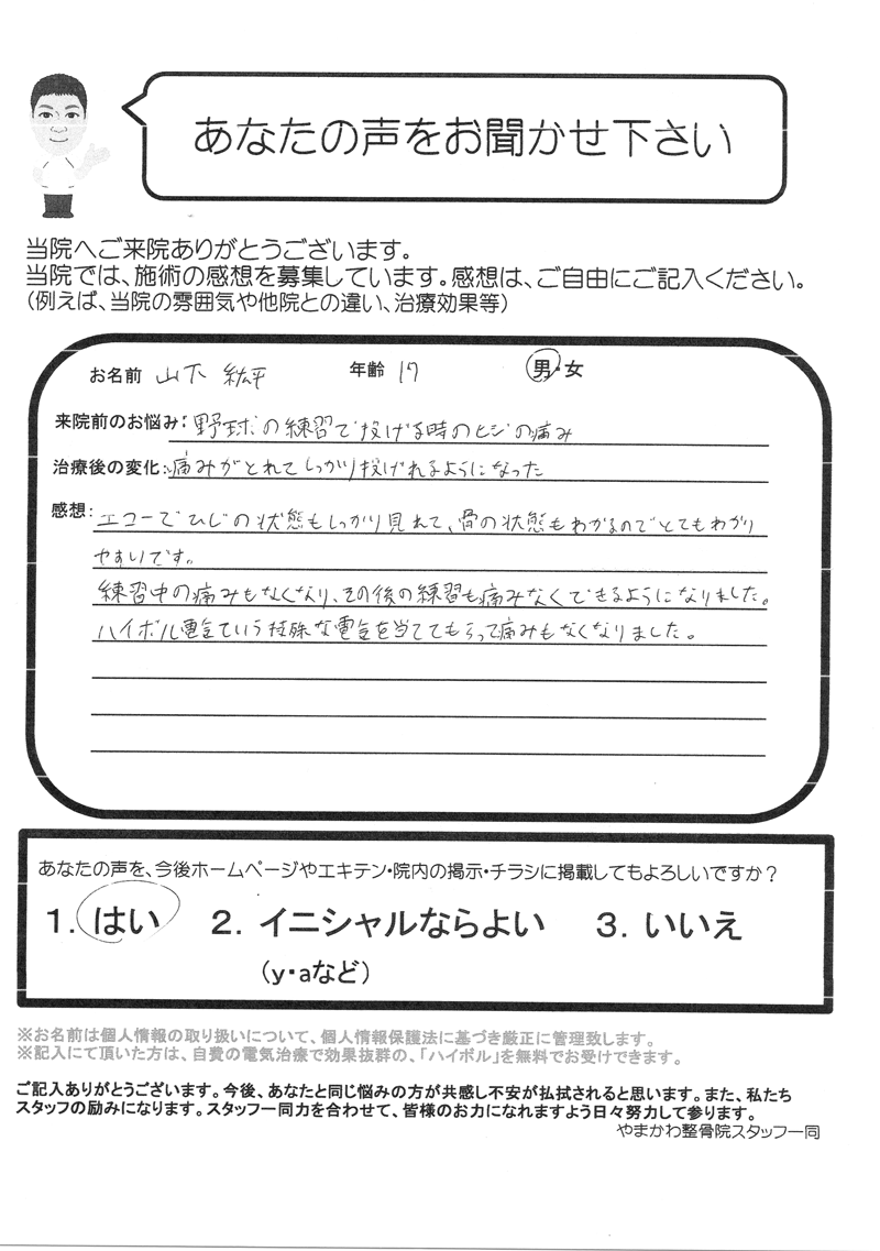 一時はどうなる事だろうと不安でいっぱいでした。電気治療(超音波、ハイボルテージ)とマッサージを行い、また経過を見るために超音波観察装置を見て解りやすく説明してくれて安心しました。おかげで関節も曲がるようになり、ほっとしています。